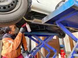 こんにちは!車検の速太郎福知山店です。下廻り錆止め塗装&マフラー錆止め塗装されたことはありますか?お車の下廻りは石が飛び散って、傷がつきやすく、防錆加工が取れてしまうことがあります。防錆加工が取れてしまうと、雪道を走って融雪剤の影響を受けてしまいます。錆は放置しておくと車体に穴が空いてしまったり、パーツが欠落してしまったり。。。深刻な問題に繋がります。パーツの交換が必要になると、高額な修理費用がかかってしまいます。下廻り錆止め塗装&マフラー錆止め塗装をすることで、錆の発生や浸食を防ぐことが出来ます。車検や12ヶ月点検の際にオススメです。ぜひ、ご検討ください。気になる方は速太郎福知山店にお問い合わせください。